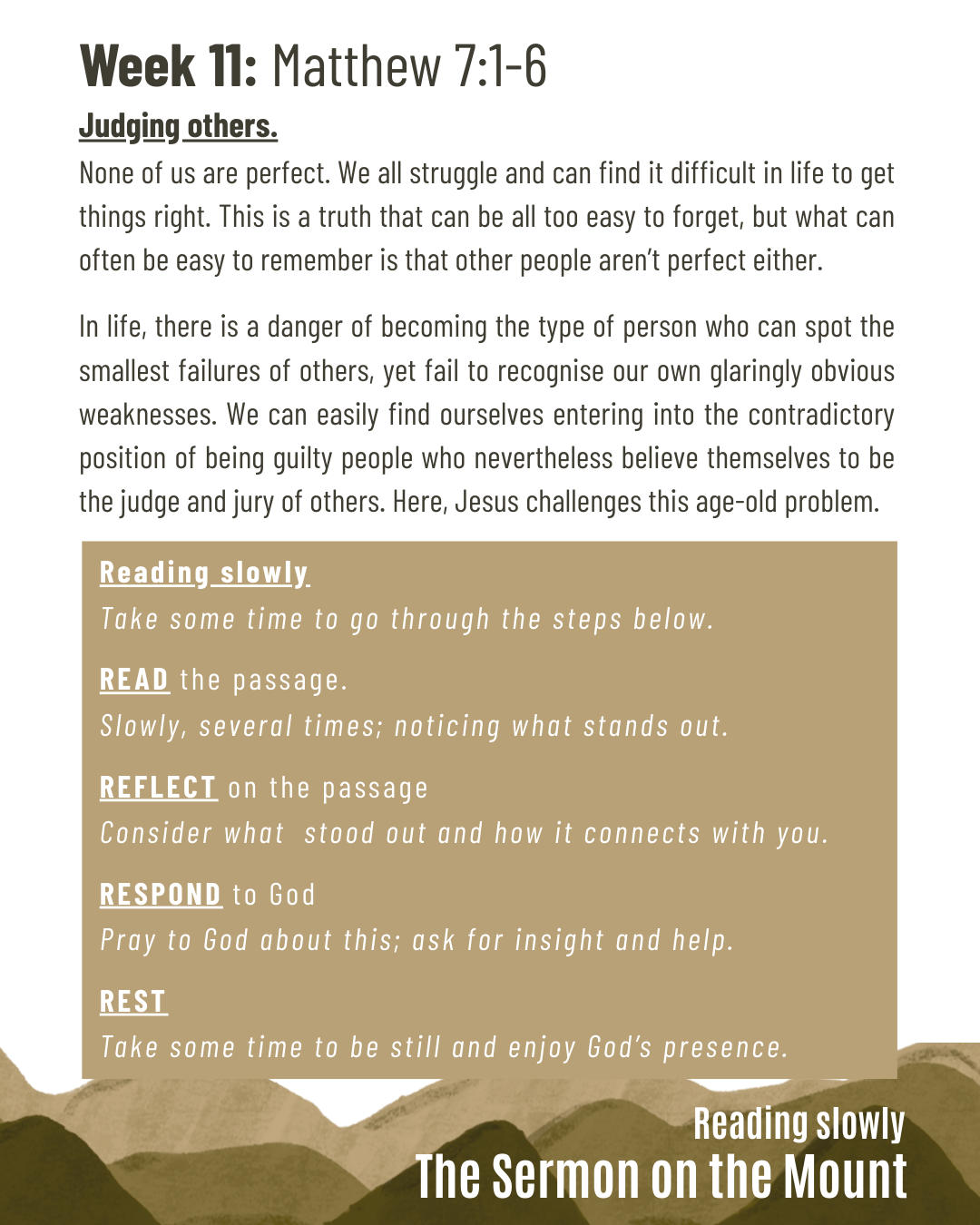 Throughout our series on The Sermon on the Mount we will have a weekly guide helping you to read slowly.